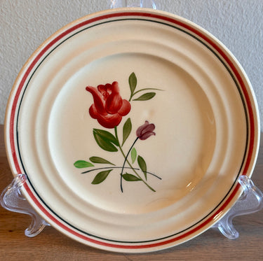 Dessertbord / Gebaksbord - Boch - decor van een handgeschilderde roos in donkerrood en kleinere rozenknop in lila/paars - met rode en zwarte bies