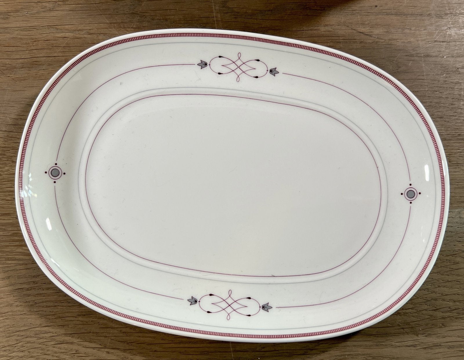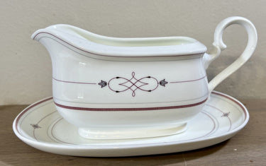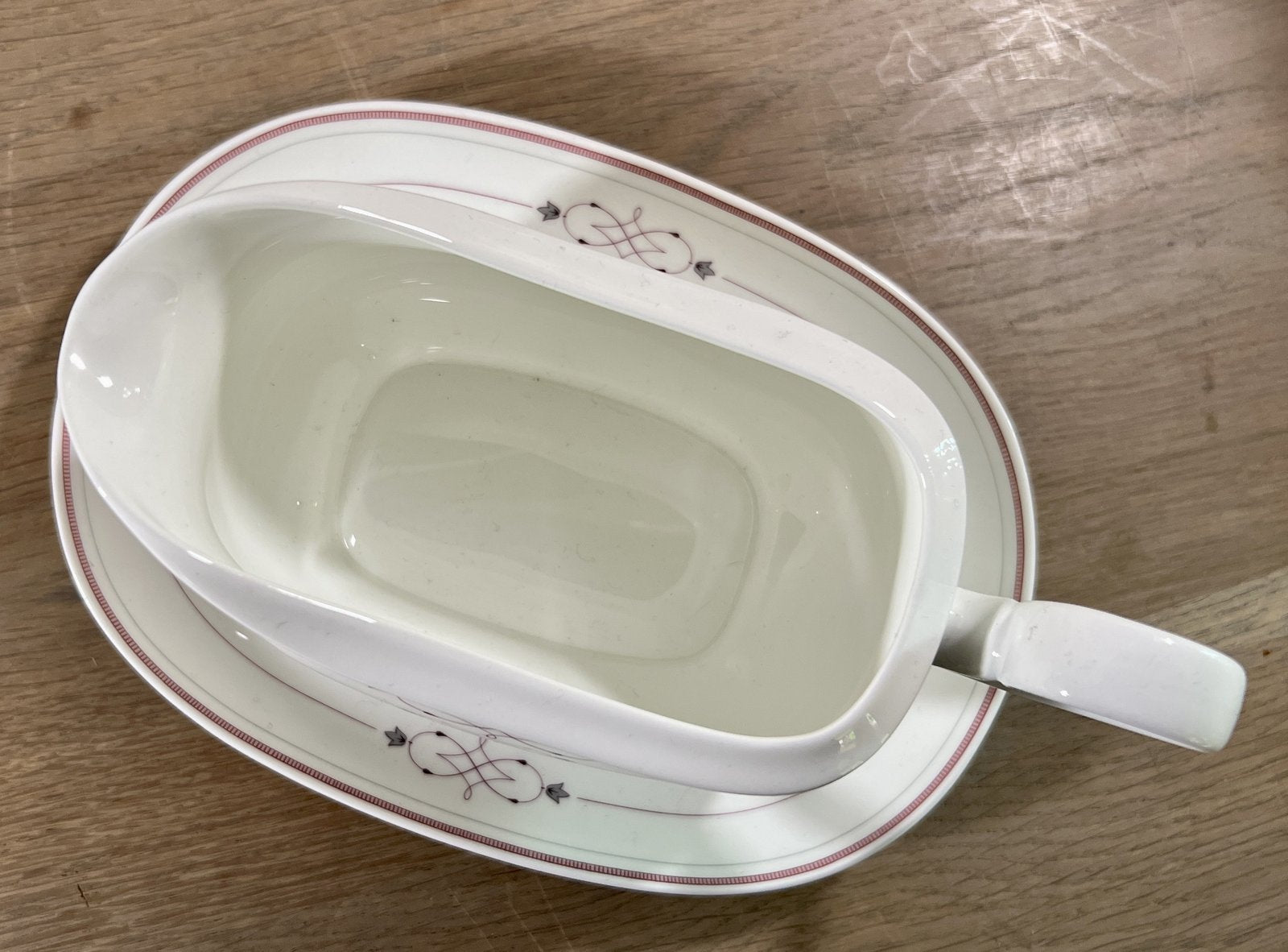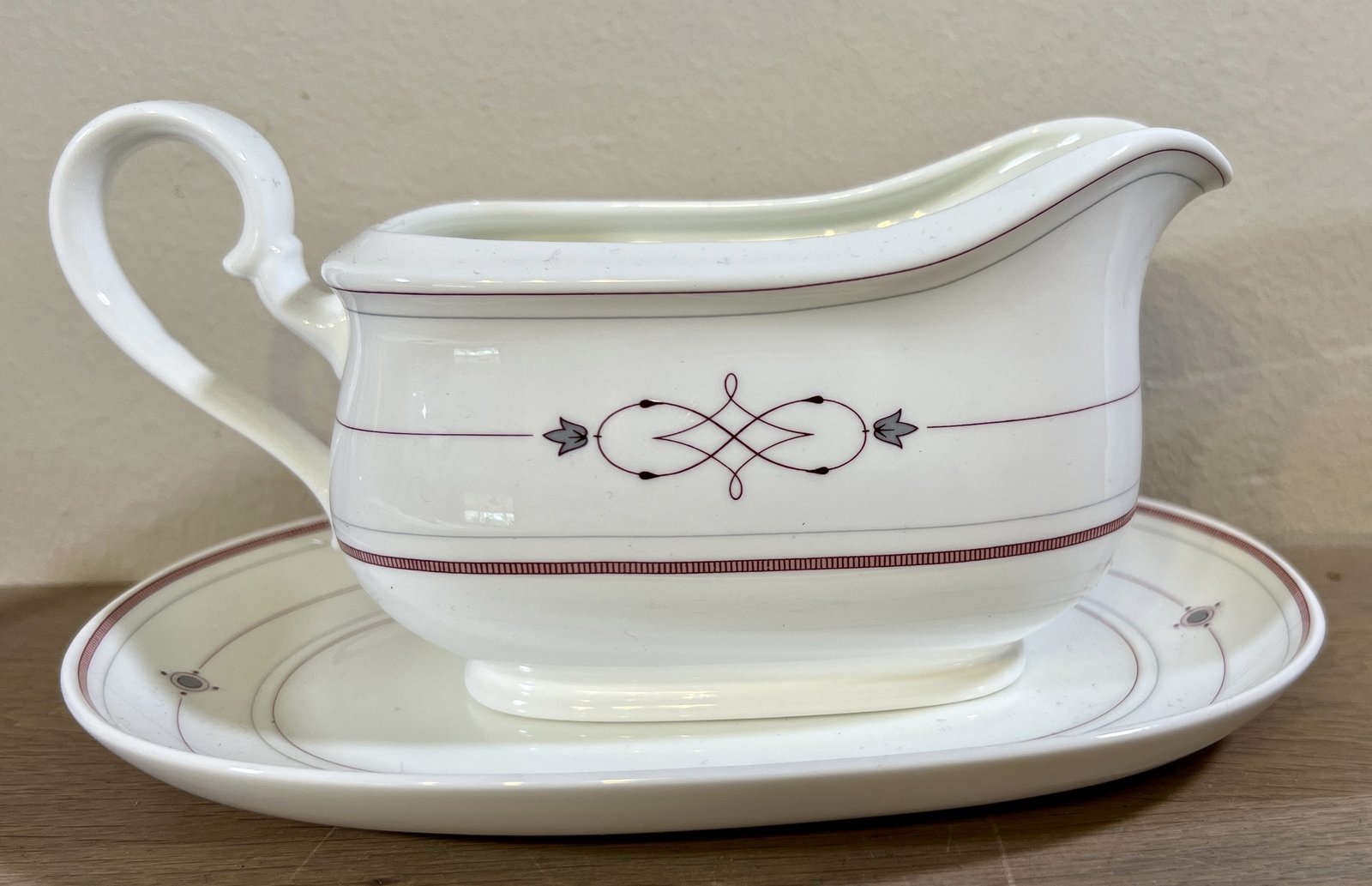 Juskom / Sauskom - met onderschaal - Villeroy & Boch - porselein servies gemaakt tussen 1980 en 2005 - décor ARAGON in gestileerd rood/roze.