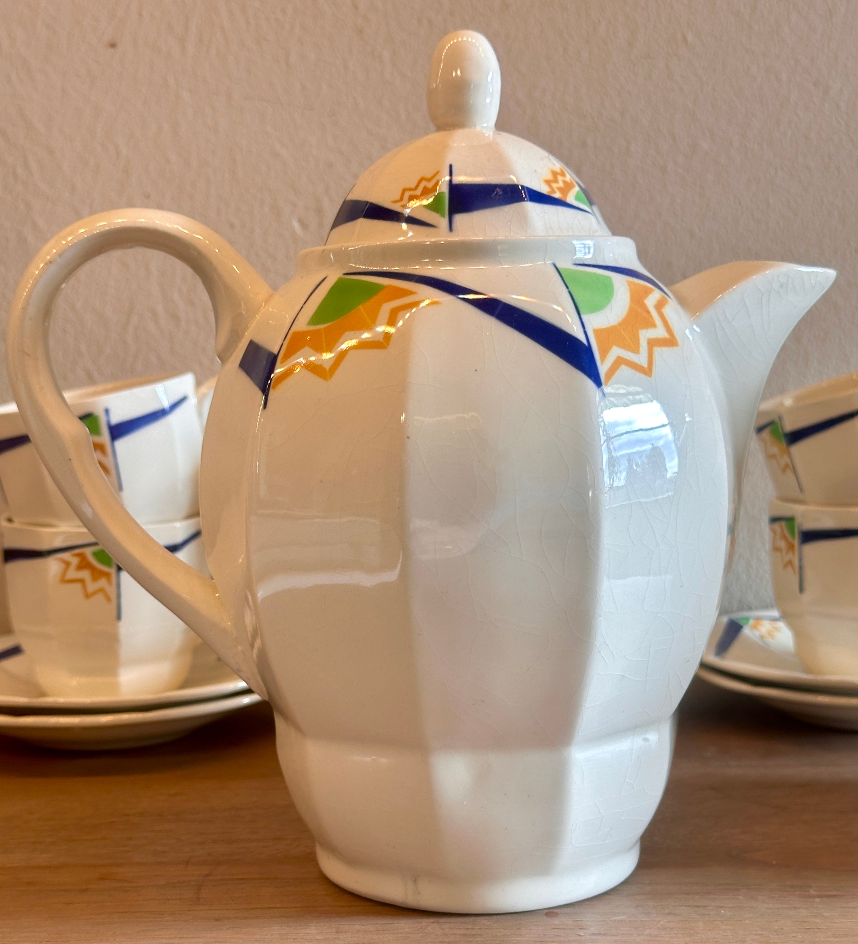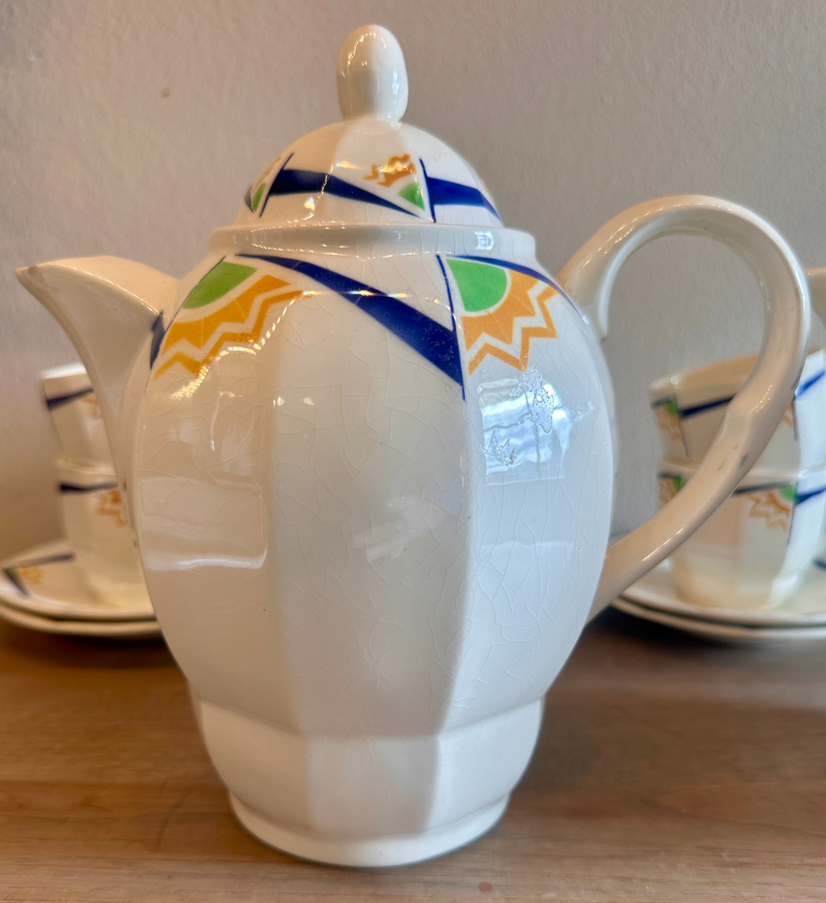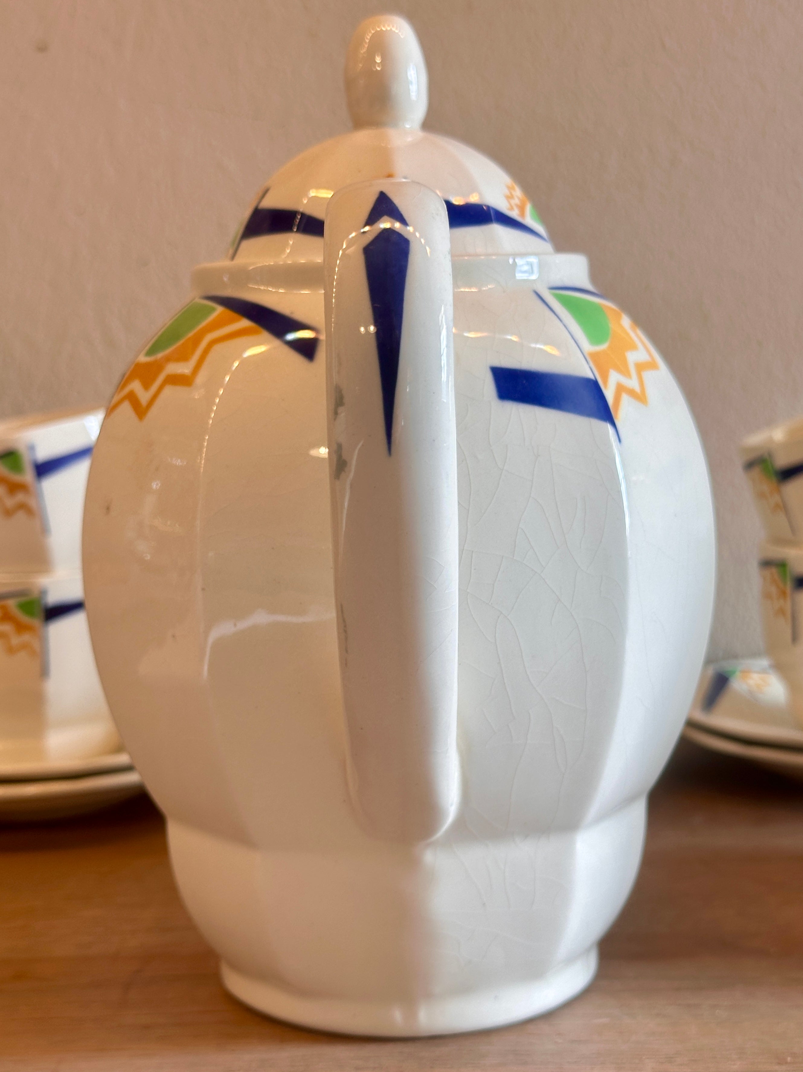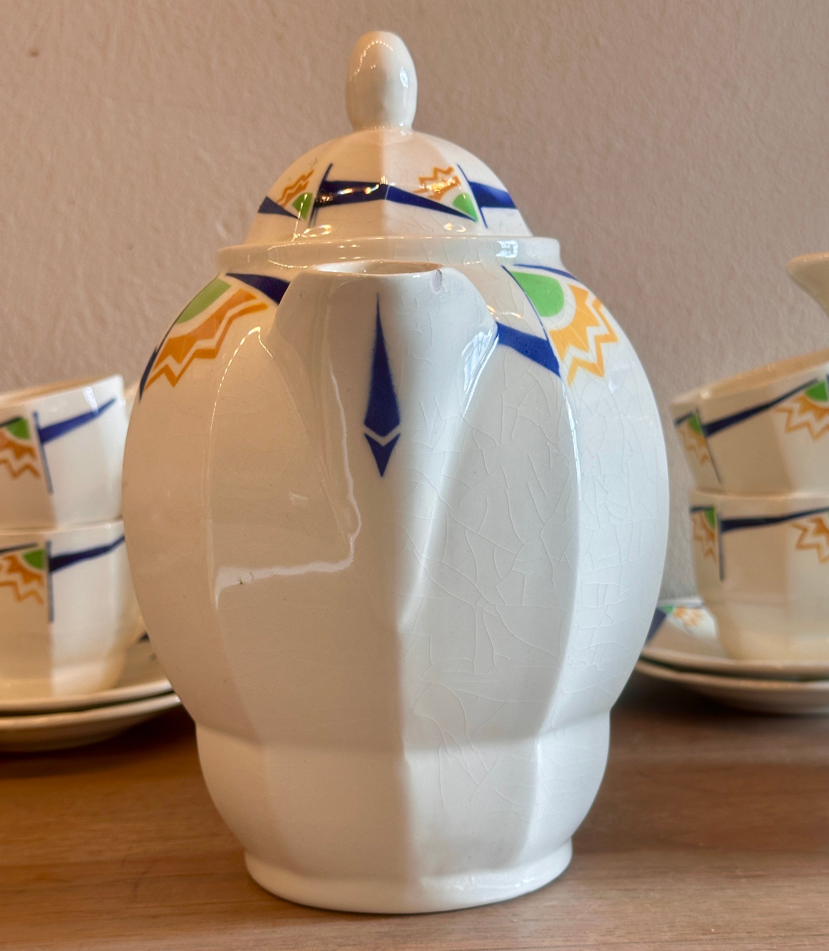 Koffiepot - Boch B.F.K - vorm BRUXELLES-A-PANS - uitgevoerd met geometrische figuren in blauw, groen, geel-oranje - Art Deco