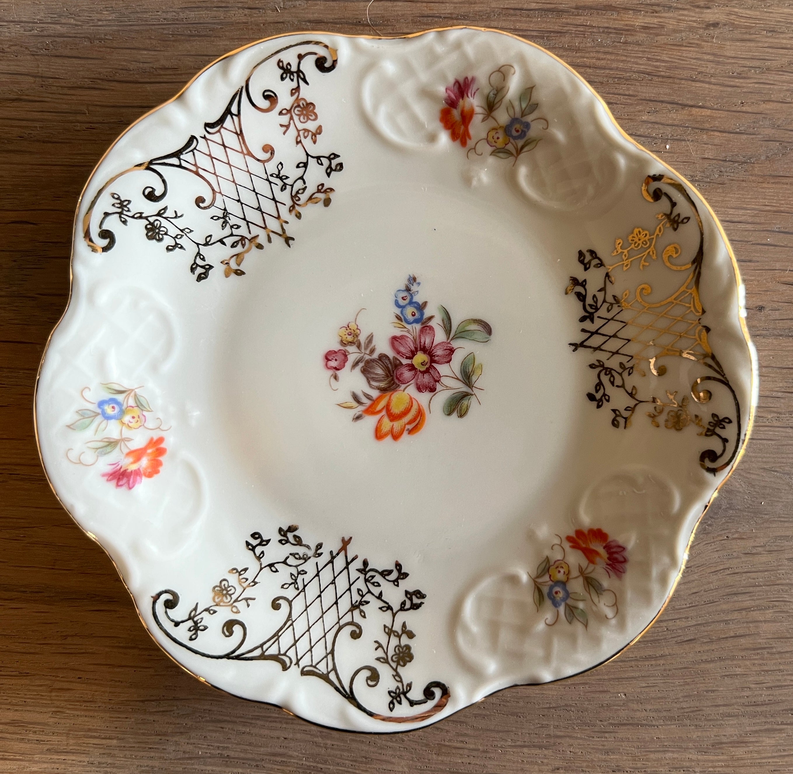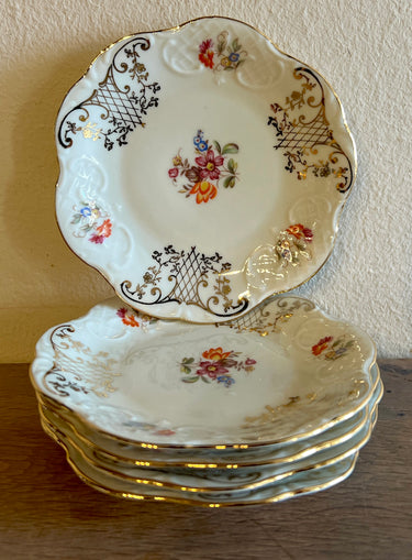 Petit-Four schaaltjes - set van 5 stuks - Winterling Bavaria (Duitsland) - decor met gekleurde bloemetjes en goudkleurige figuren