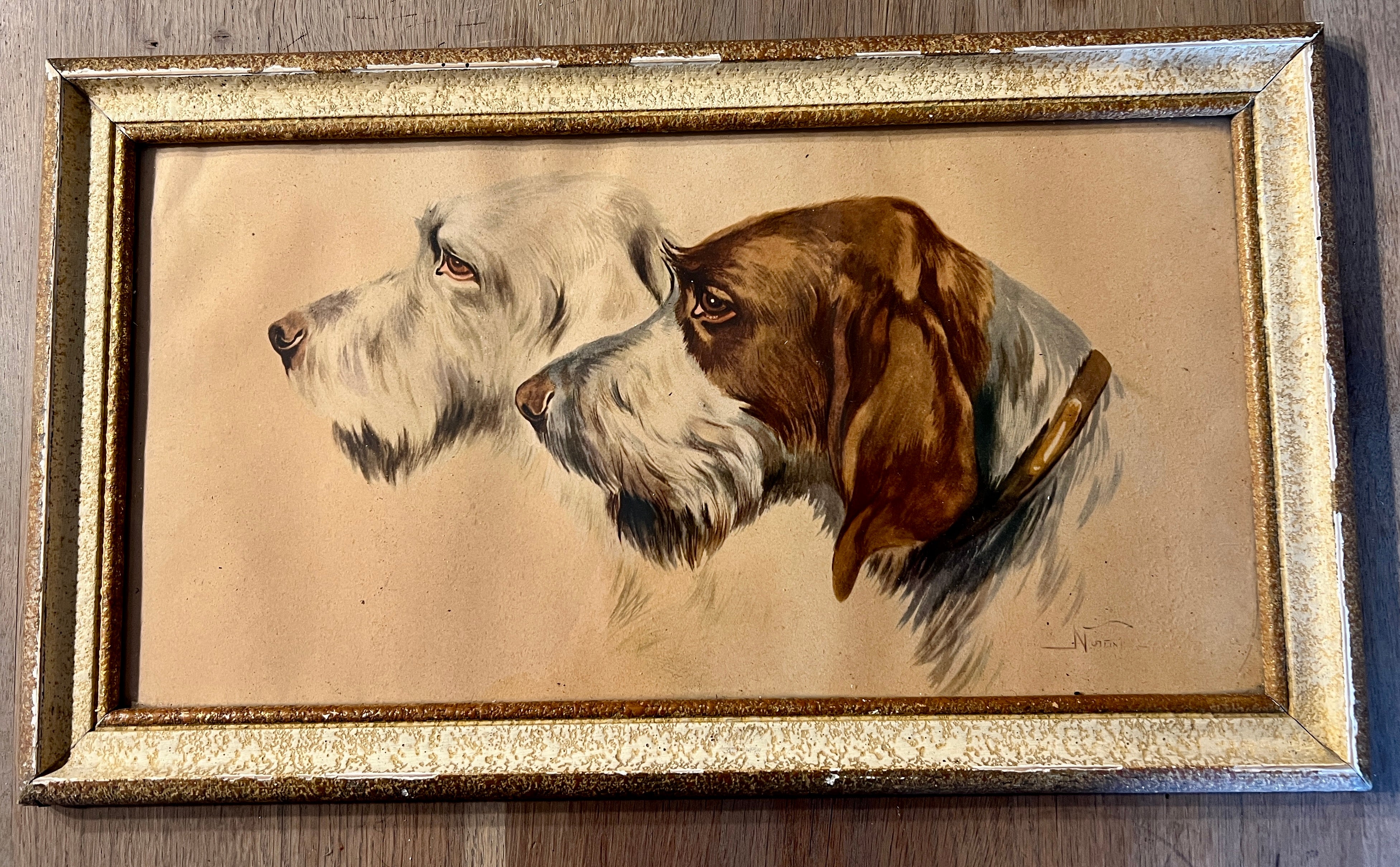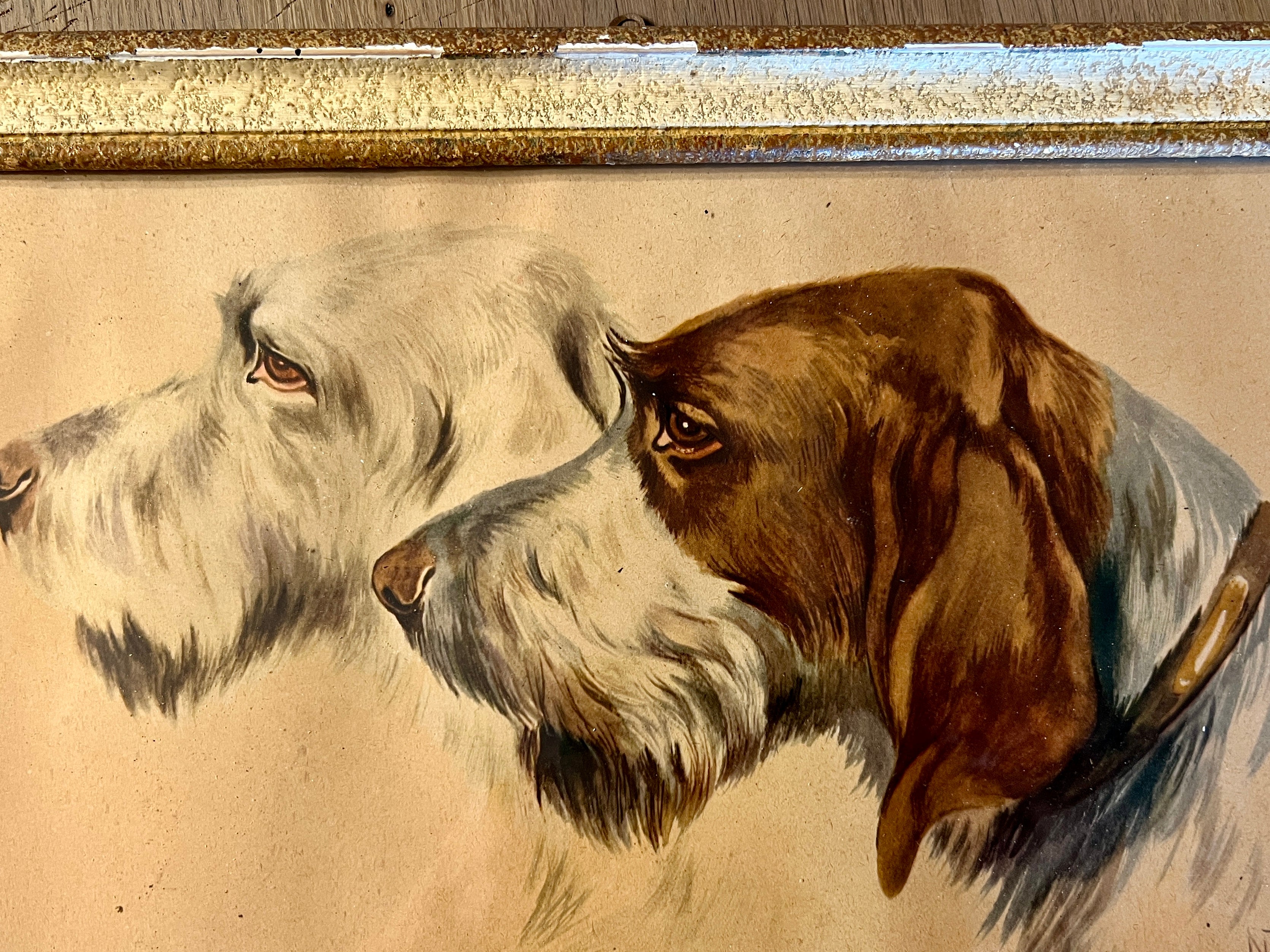 Plaat / Print in lijst met afbeelding van, hoogstwaarschijnlijk, twee fox-terrier honden - onleesbare signatuur rechtsonder