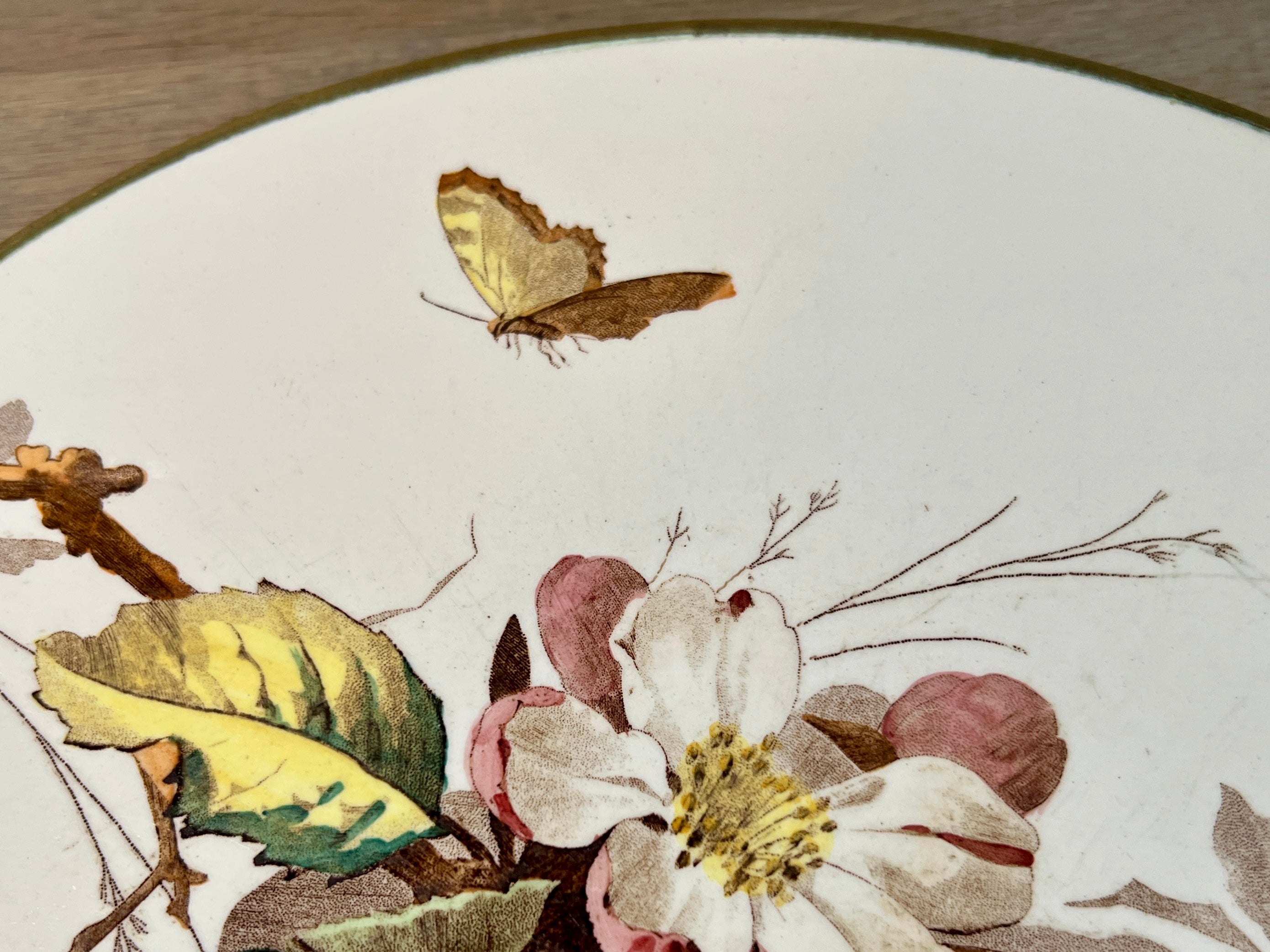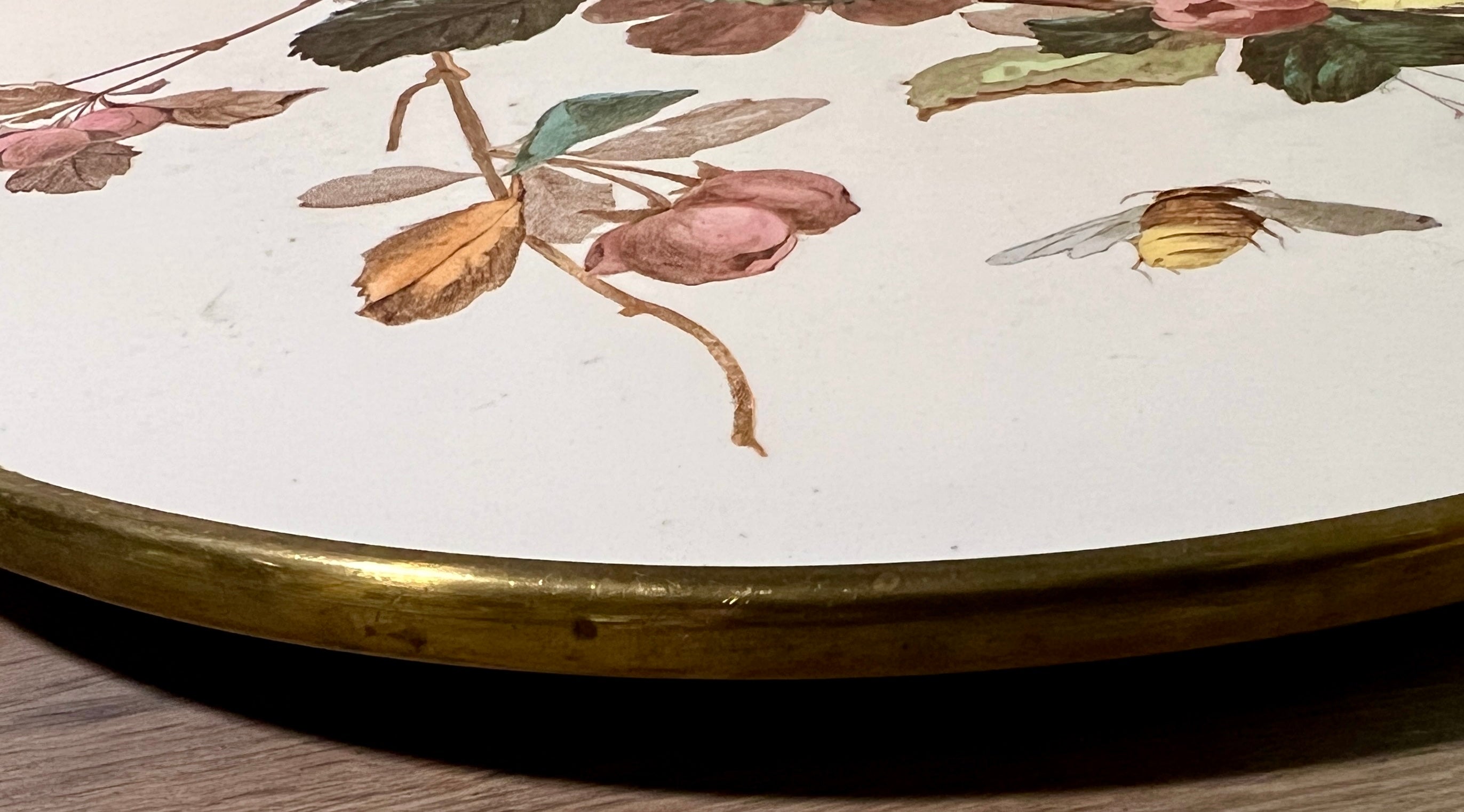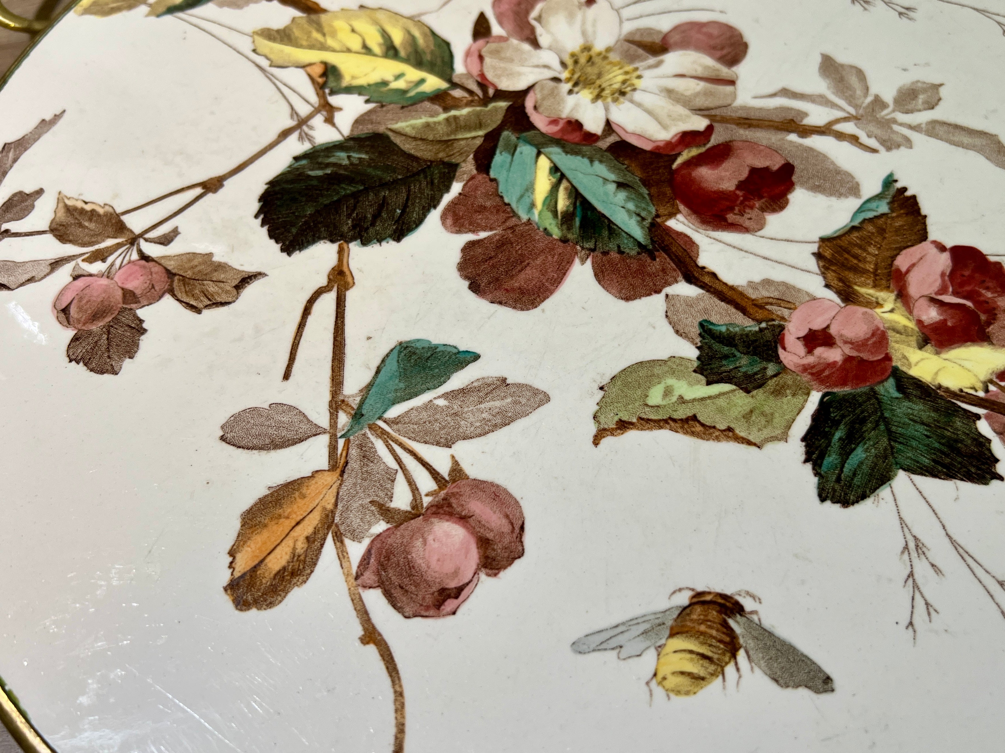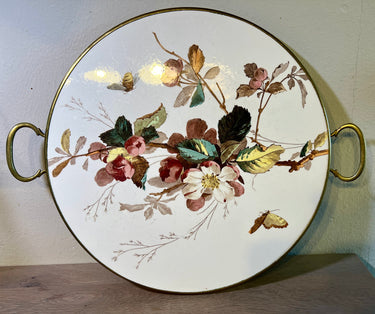 Taartplateau - op 3 voetjes - ongemerkt (Villeroy & Boch?) - koperkleurige omvatting - decor in meerkleuren met kersen- of appelbloesem, vlinder en bijtje