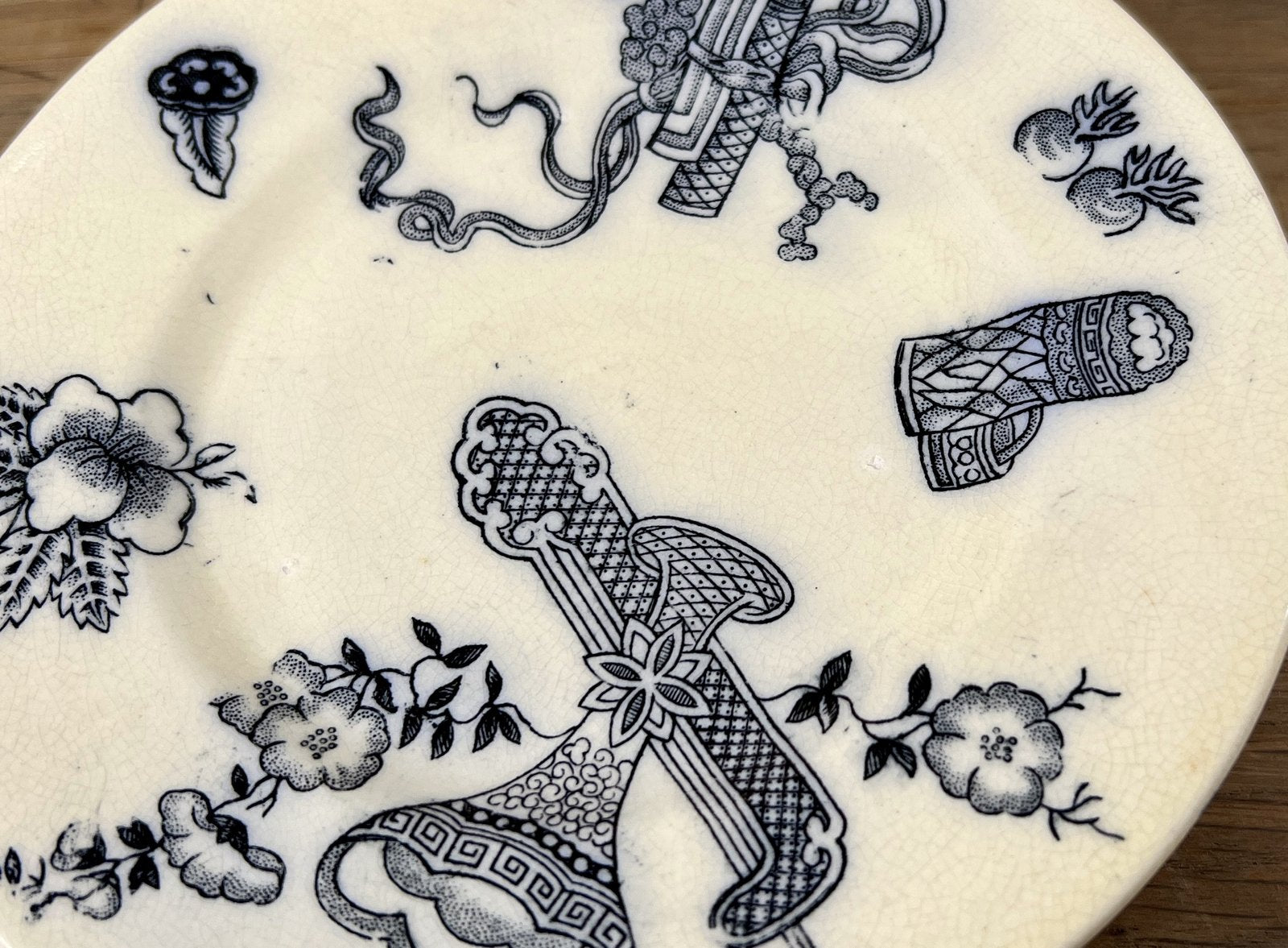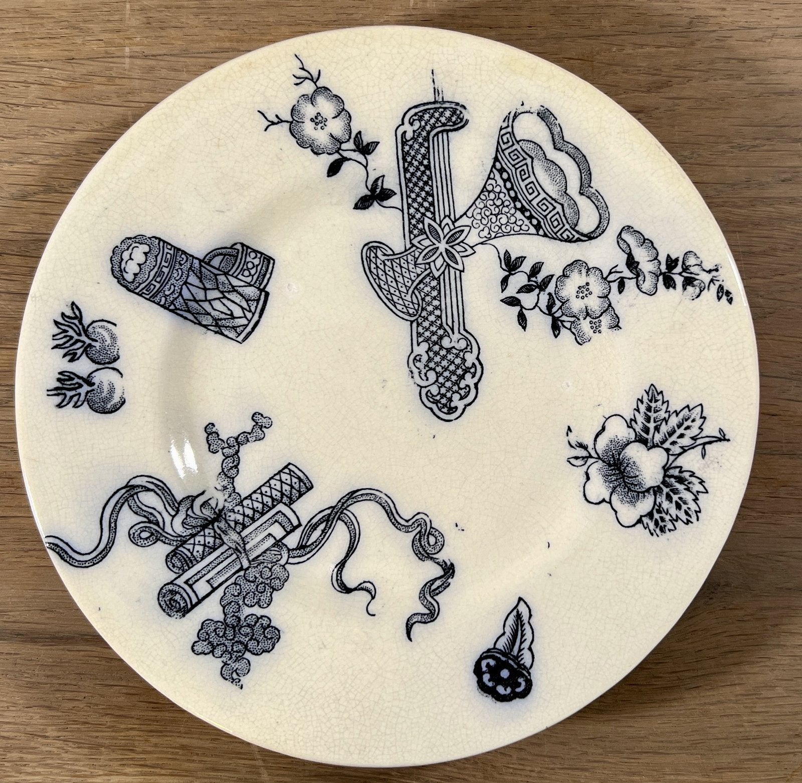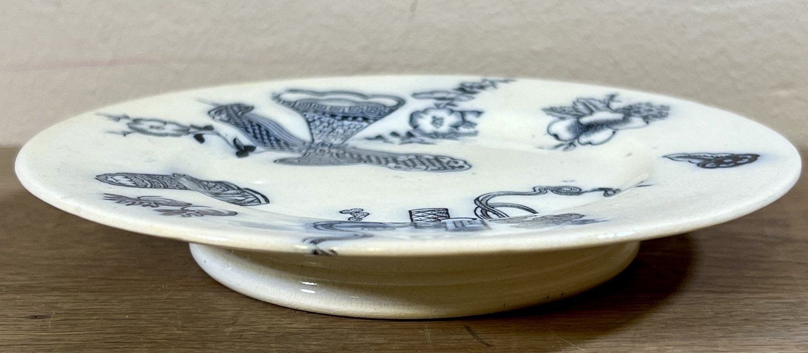 Tazza / Presenteerschaal - op lage voet - klein model, kinderservies - gemerkt met IVOIRE (waarschijnlijk Nimy) - décor met bloesems en schepen in Japanse stijl uitgevoerd in donkerblauw/vloeiblauw.