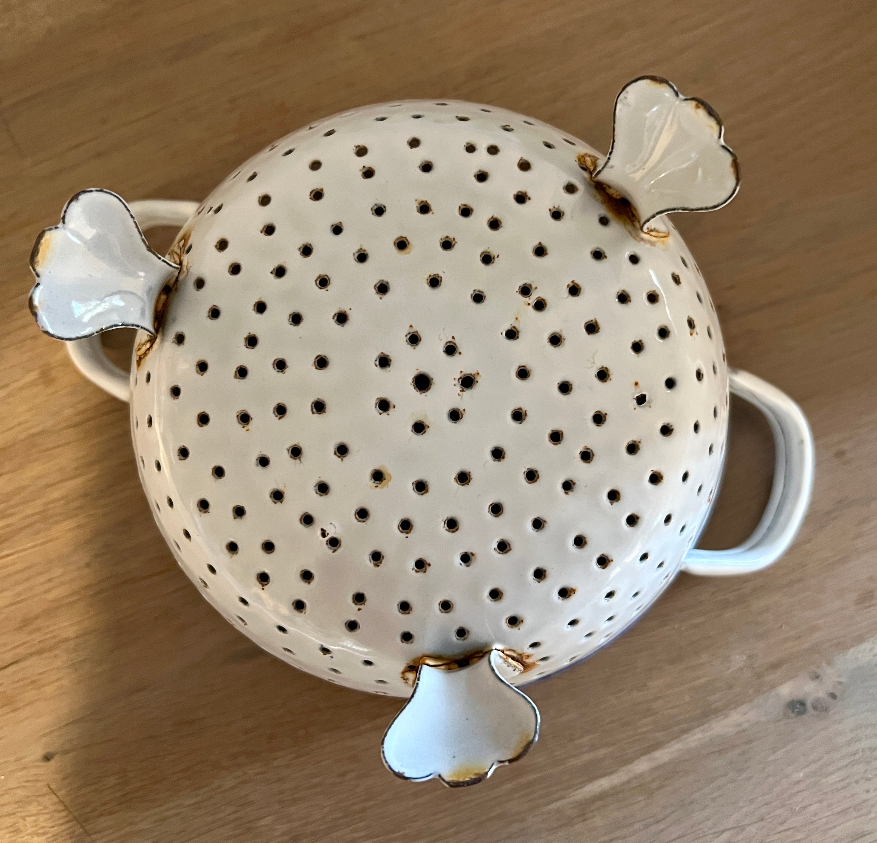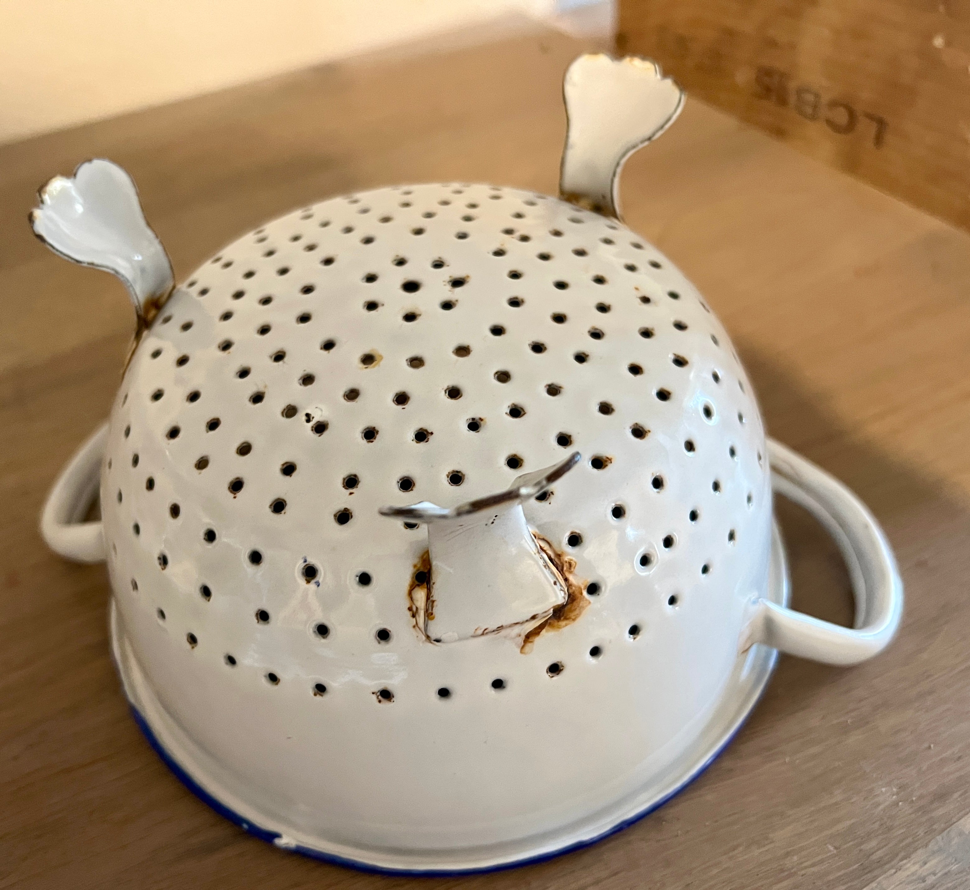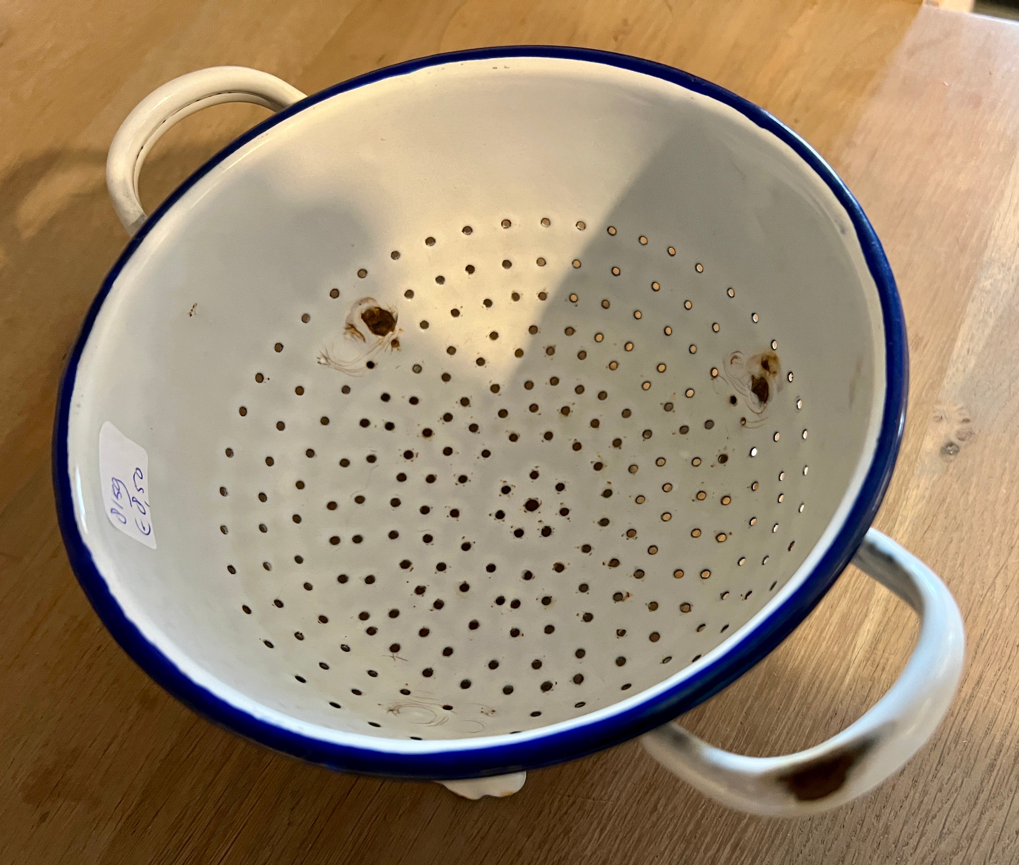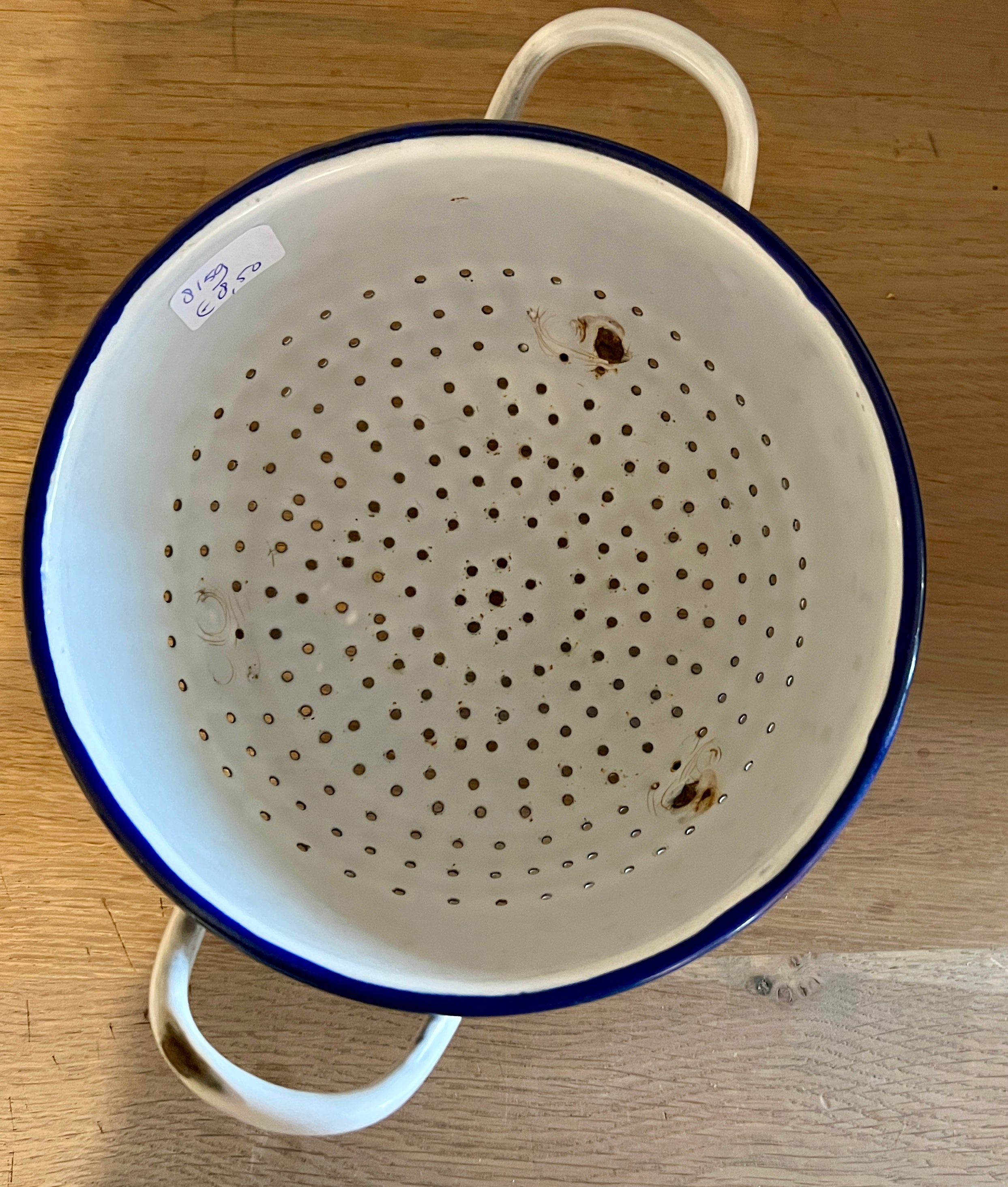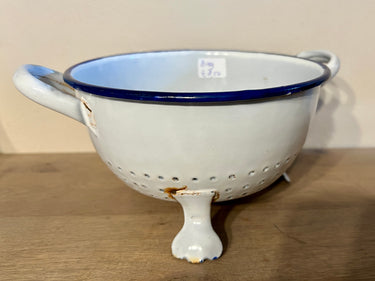 Vergiet - kleiner model - wit emaille met blauwe rand en sierlijke voetjes