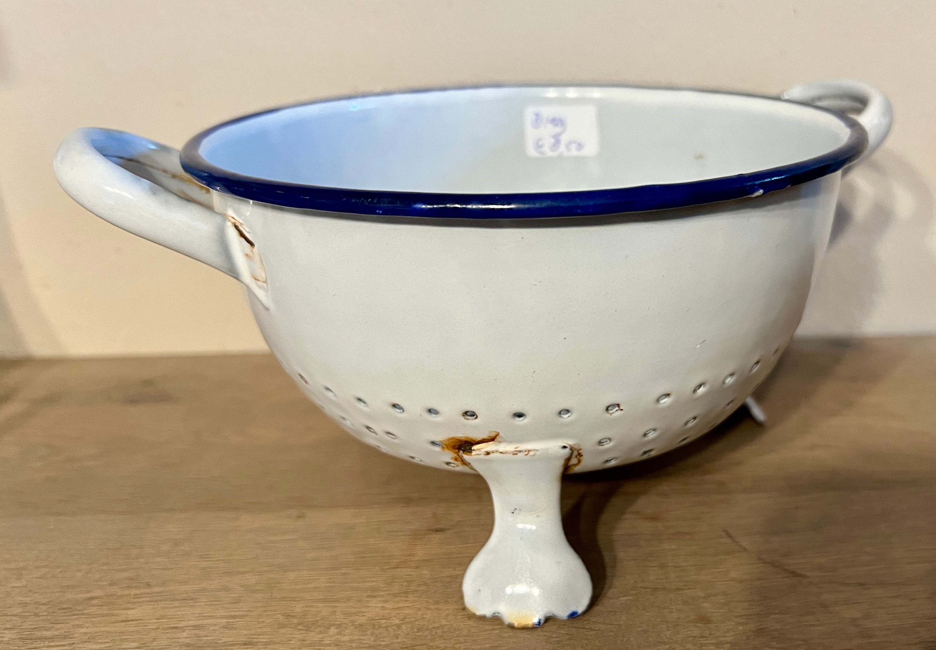 Vergiet - kleiner model - wit emaille met blauwe rand en sierlijke voetjes - 1950-1960 (of ouder)