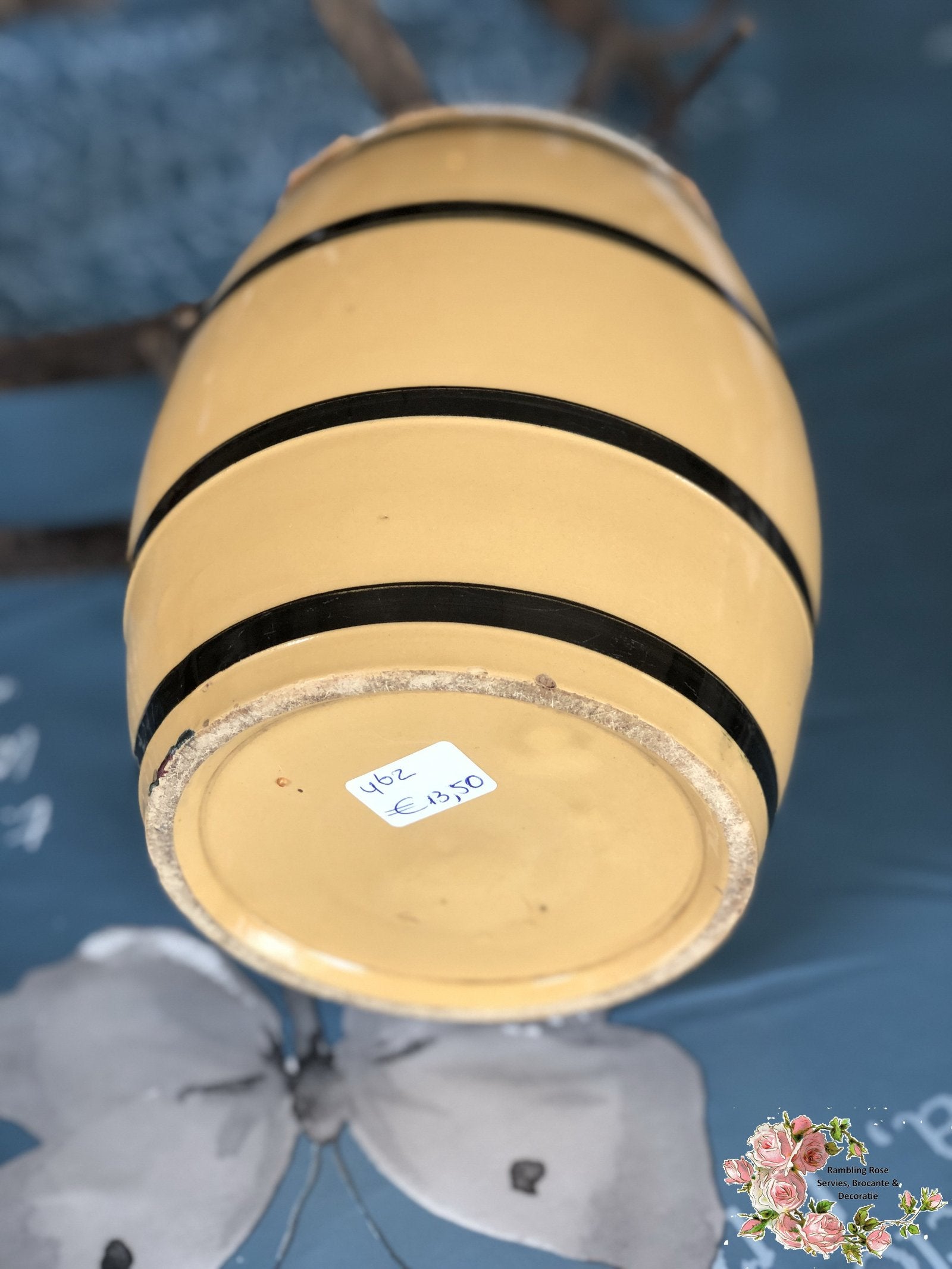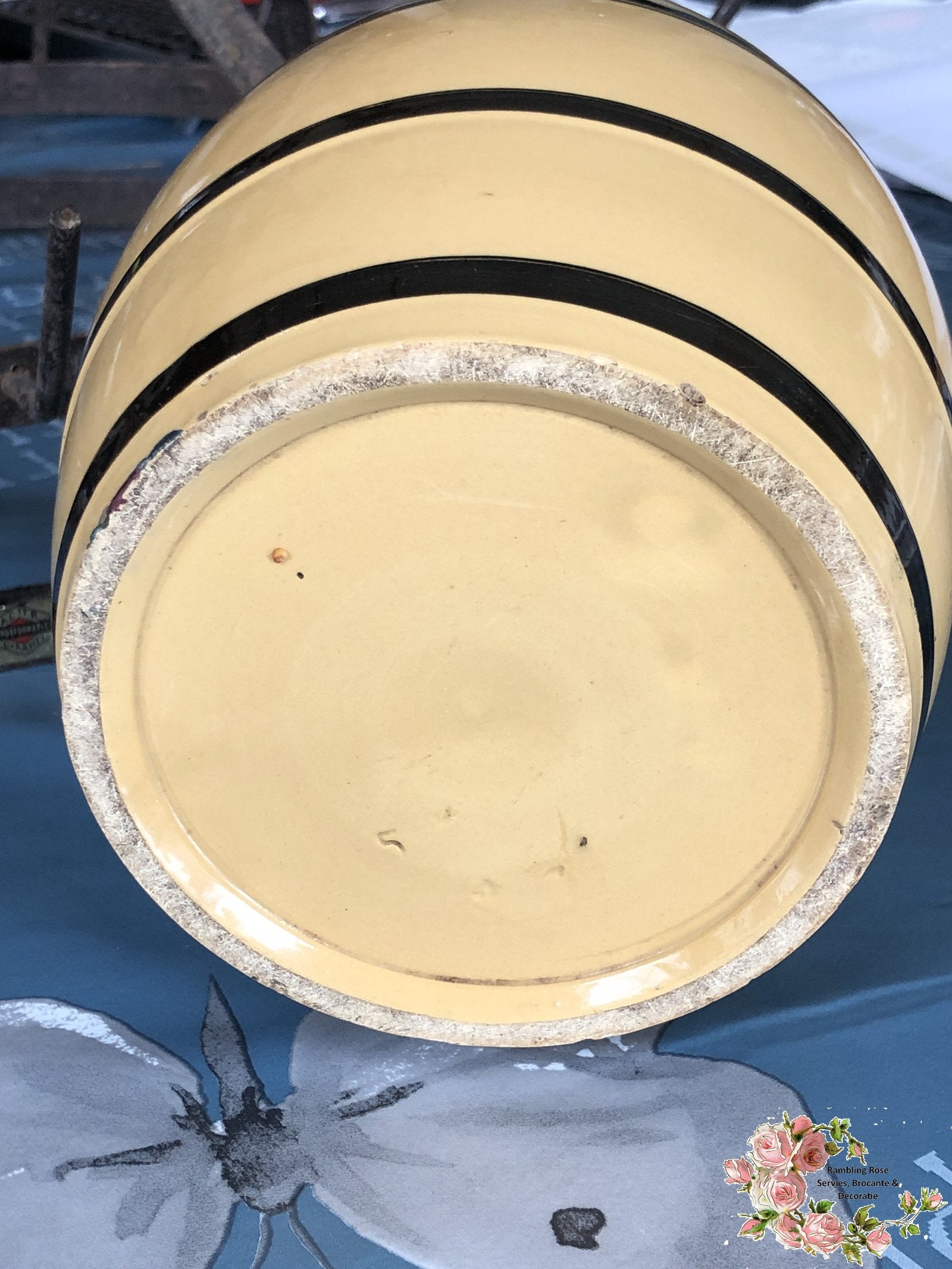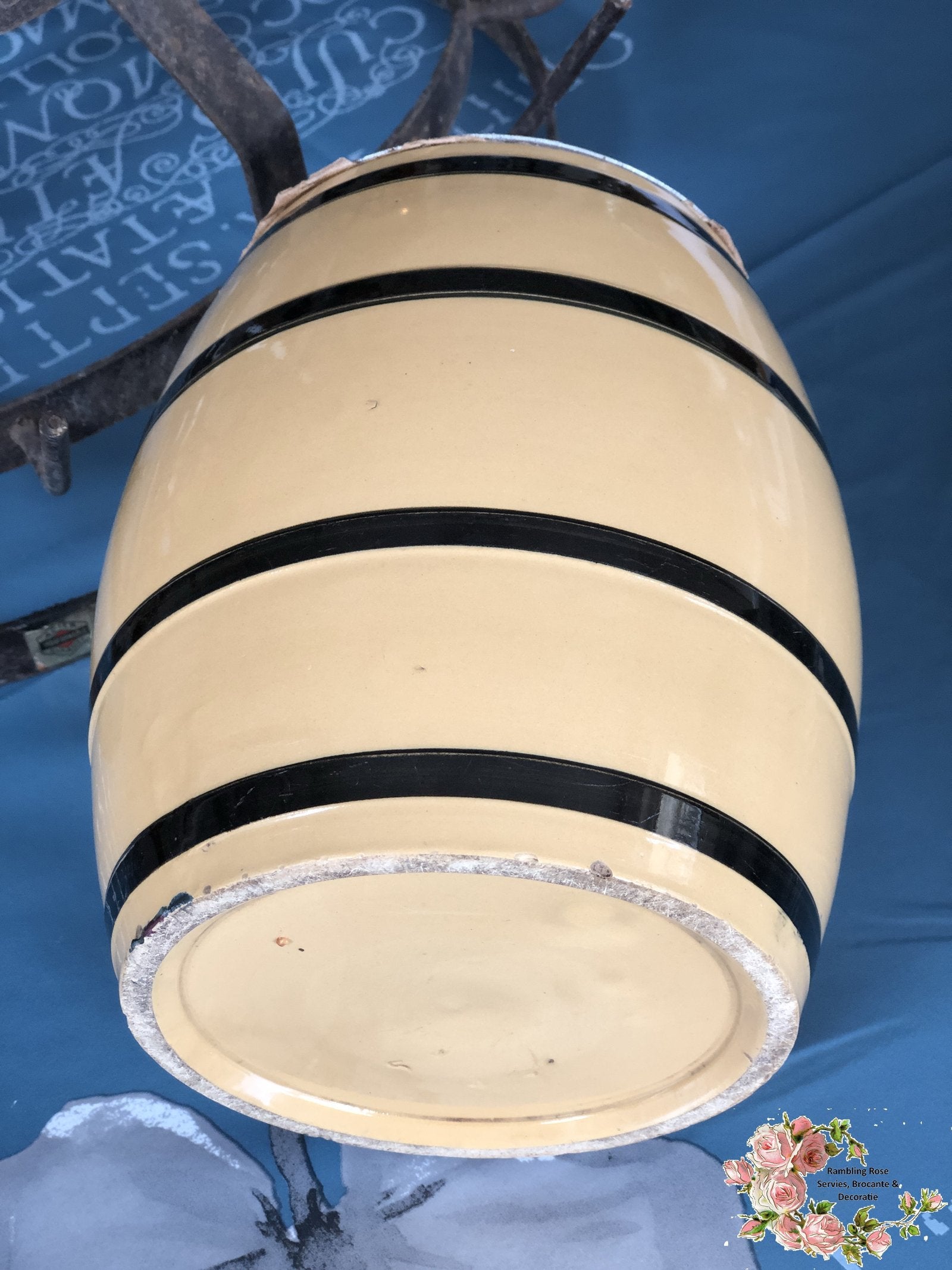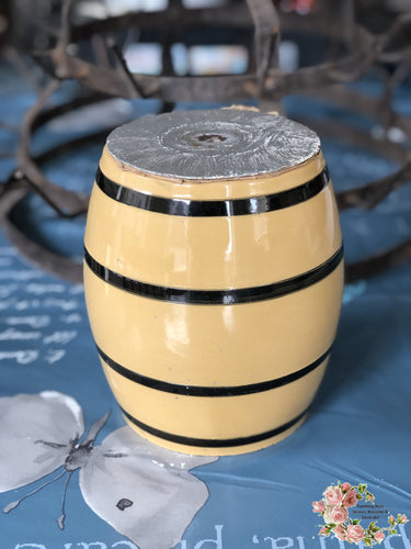 Voorraadpot – tonnetjesmodel – banden in zwart op okerkleurige ondergrond.