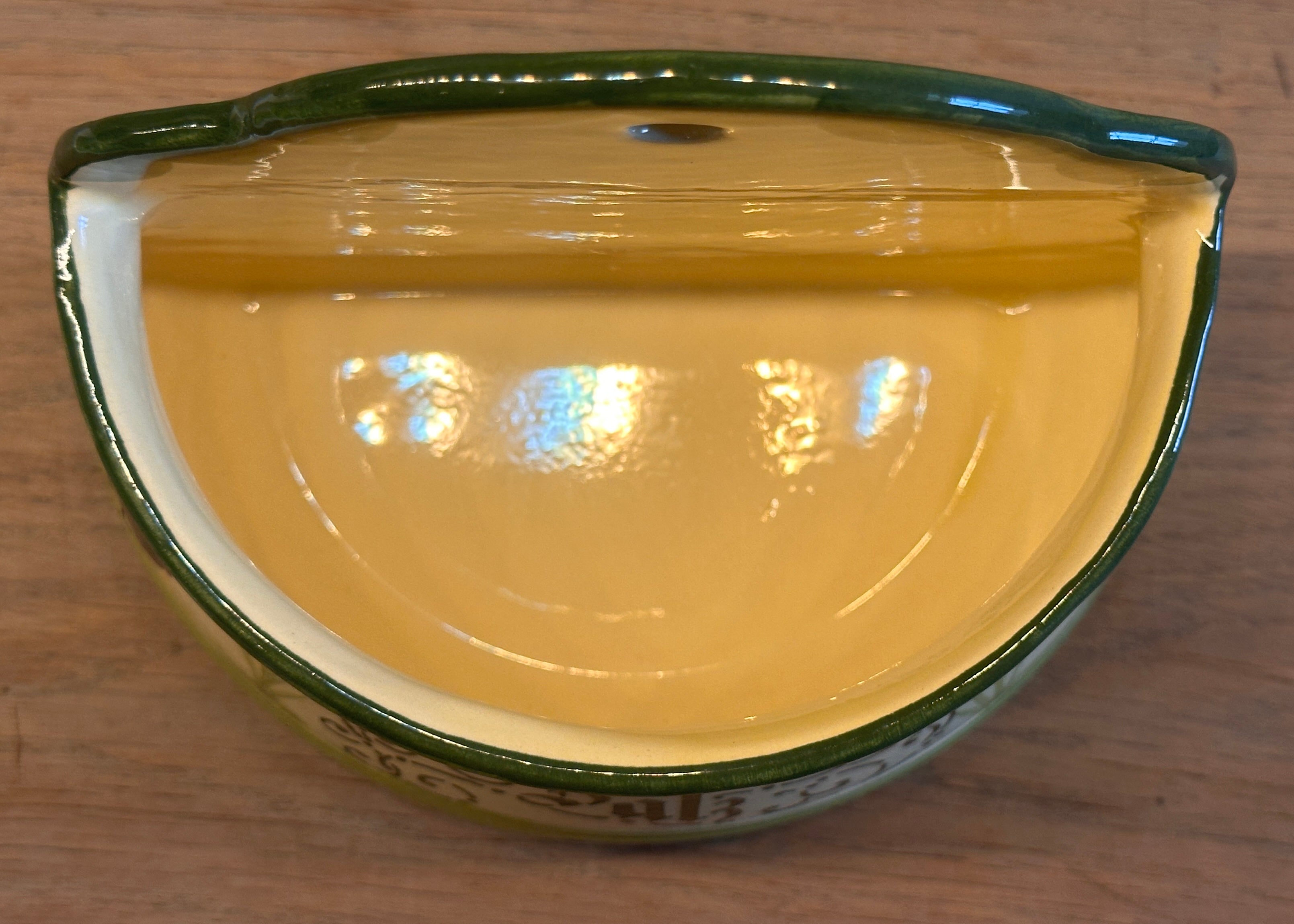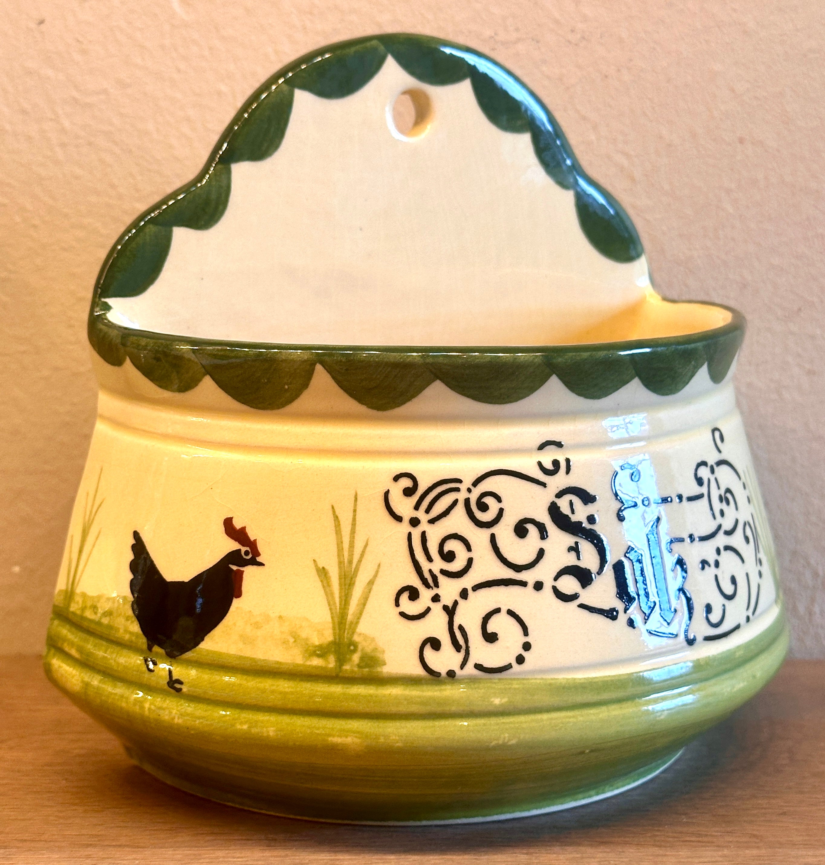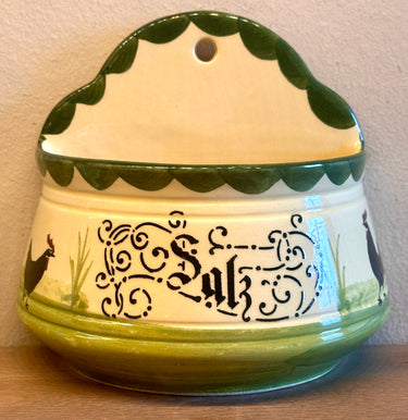 Zoutpot - hangend model - Zeller faience Germany (ouder stempel) - decor Hahn & Henne (Rooster & Hen) met opschrift SALZ- handbeschilderd