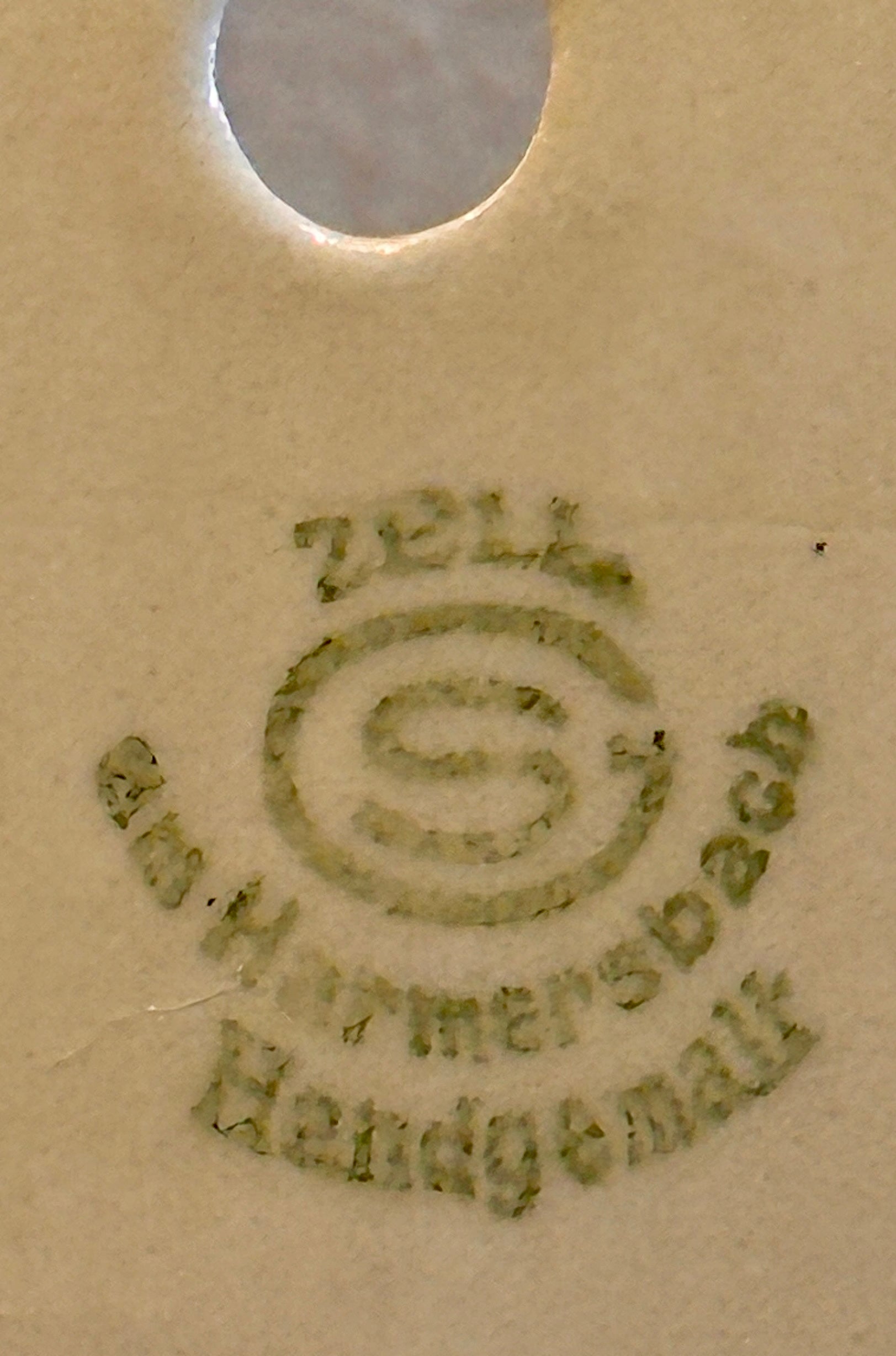 Zoutpot - hangend model - Zeller faience Germany (ouder stempel) - decor Hahn & Henne (Rooster & Hen) met opschrift SALZ- handbeschilderd, model 4571 - ontwerp Karl Schoner